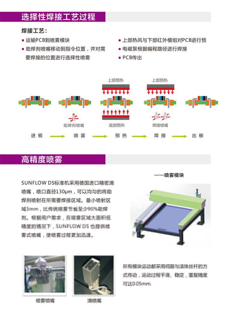 2.精確設(shè)置過的助焊劑噴涂,只施用于焊盤和插腳上,可以確保PCB板的高潔凈度,無須另外清潔。
